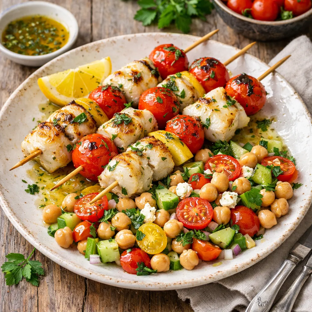 Apports nutritionnels et bienfaits santé du plat brochettes de lotte et salade pois chiches